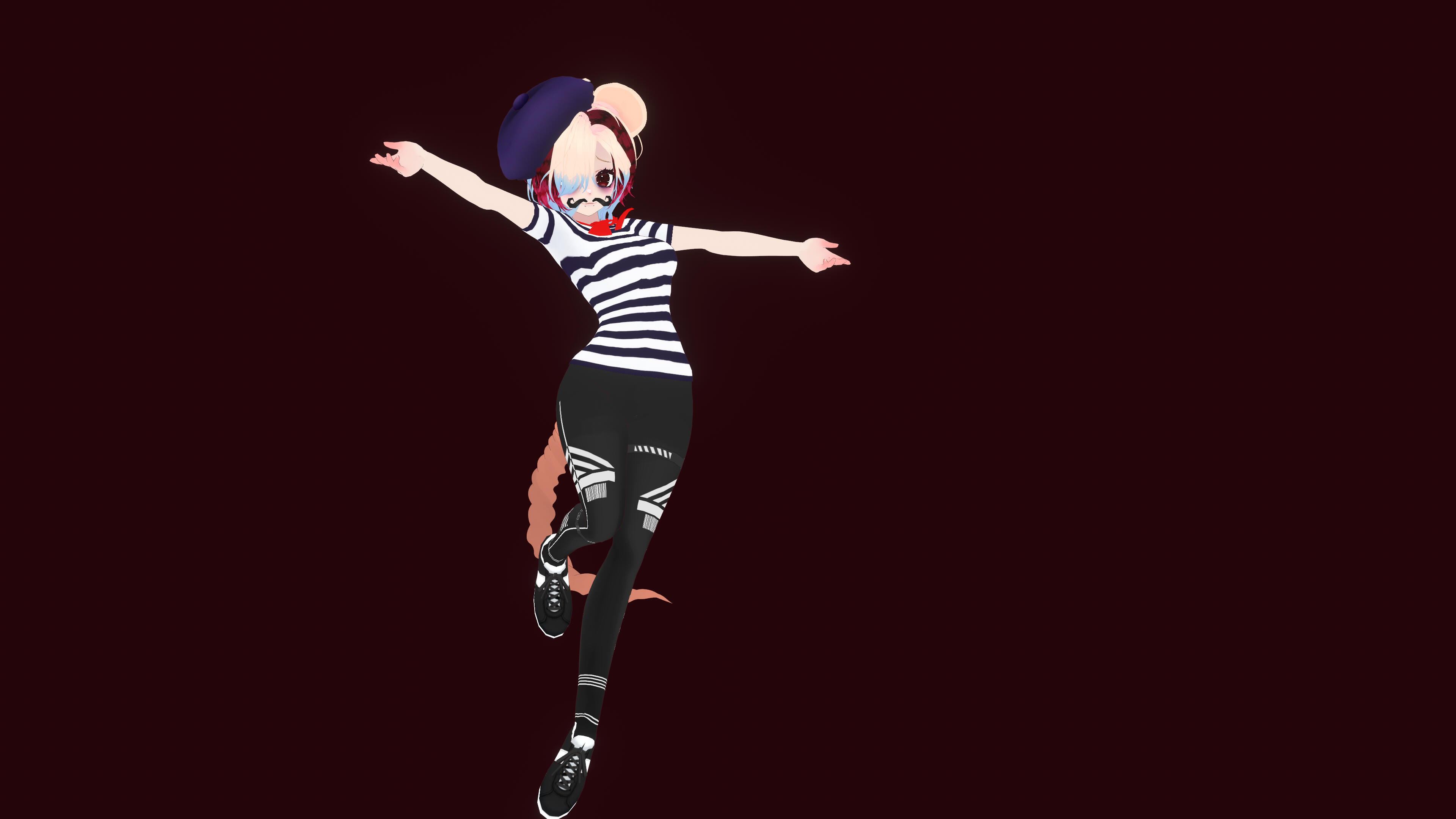 Hair Color: Champagne blonde with a blue dip-dye, and bordeaux (deep red) streaks with raccoon stripes.
