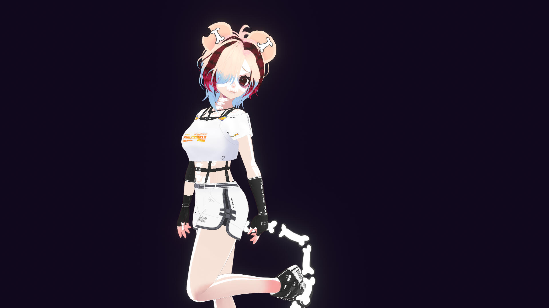 Fashion: white and light blue techwear with glowing orange details. She has no canon outfit, so she can wear whatever you'd like as long as its within the same vibe.
